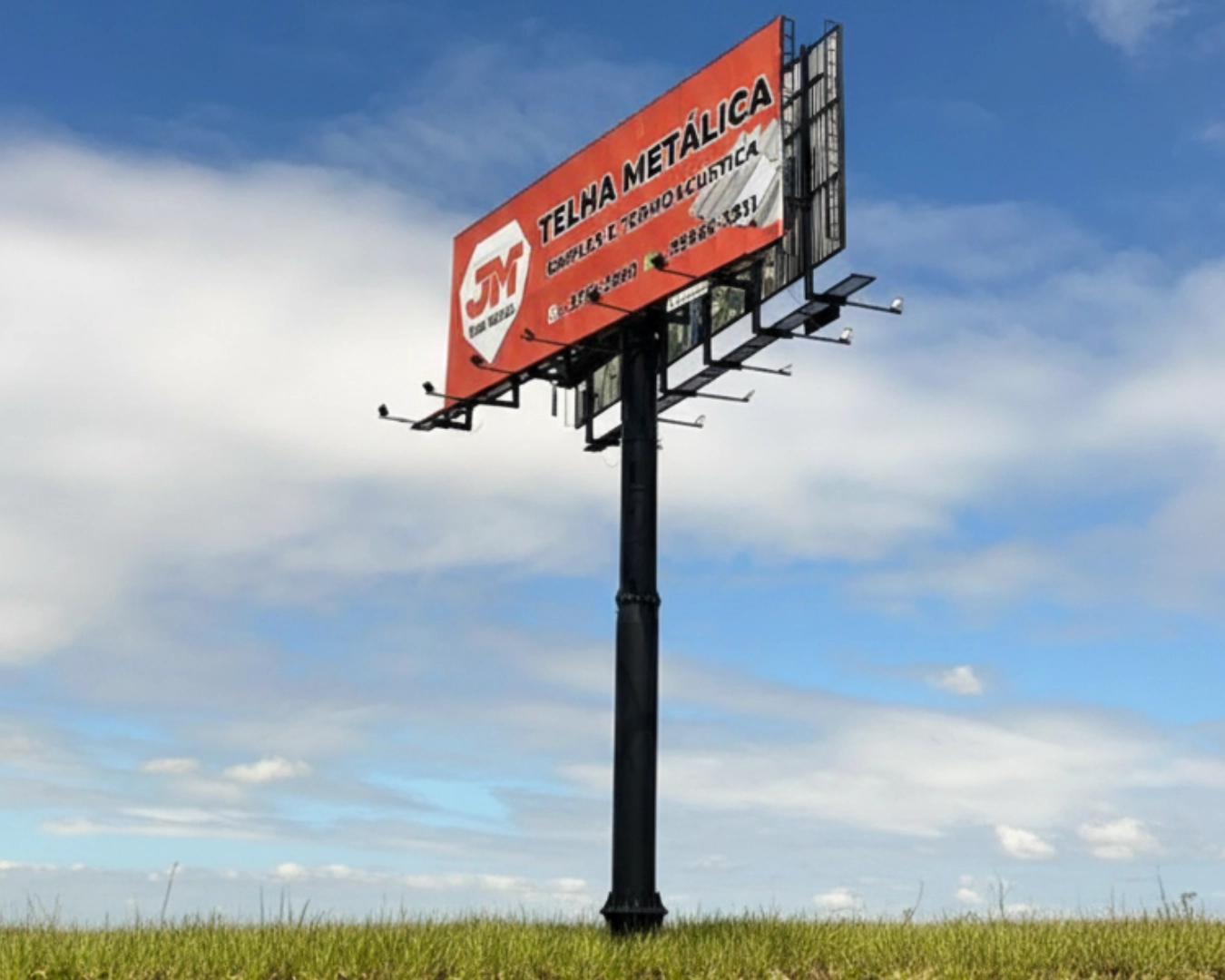 O gigante das rodovias. Esta estrutura em formato de “V” foi projetada para maximizar o retorno sobre o investimento publicitário, capturando a atenção do tráfego em ambos os sentidos da via simultaneamente. Com uma área visual total de 150m², exige uma engenharia de fundação e sustentação que é a especialidade da WorldConnect.